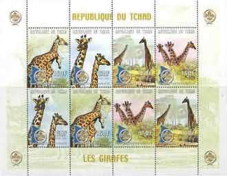 Folhinha com 8 selos, com valor facial de 150F cada, sobre fauna do país Parques e Reservas Nacionais do Chade, com emblema do Escotismo.