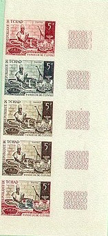 Selos são emitidos pela República do Chade desde 1959, com o primeiro, no valor facial de 15F, o selo mostra... algodão, boi...