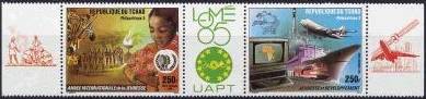 Série de 2 selos emitida em comemoração a Exposição Filatélica ocorrida em 1985, em Lomé (capital da República Togolesa), com inscrições: Ano Internacional da Juventude, Philexafrique 3 e logotipo UPU. Vinheta central: LOMÉ 85 - UAPT? Valor facial: 250F. NT